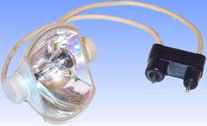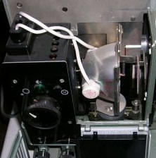 Hier sieht man die seltene, recht kurzlebige ( nur ca. 40 Stunden) und extrem teure MARC 300 -Lampe. Es wird ein externes Vorschaltgerät benötigt. Ab 1967 konnte der Projektor als "Sonderanfertigung" bestellt werden werden.