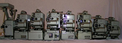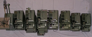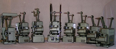 Viele Änderungen / Unterschiede sind nur bei genauem Hinschauen ( oder nach dem Aufschrauben ) erkennbar. Die ab Sommer 1963 produzierten Projektoren wurden mit einer Dauerschmierung mit Sinterlagern ausgeliefert. Dadurch sind die roten "Schmiernippel" weggefallen. Der Abtrieb von der Motorwelle aus war in den ersten Serien mit Keilriemen später mit Flachriemen ( auch ab ca. 1963 ) ausgeführt. Der Kunststoff in den Flachriemen löste sich im harten Alltag allerdings auf, so dass auch wieder Umbausätze zurück auf Keilriemen angeboten wurden. Erst in den späteren Serien wurde Asbest zum Wärmeschutz verbaut ( hat aber vorher ja auch funktioniert ). Die Unzähligen kleinen Veränderungen am Hauptschalter sowie weitere Kleinigkeiten sollen nicht unerwähnt bleiben. Impressionen meiner kleinen Sammlung