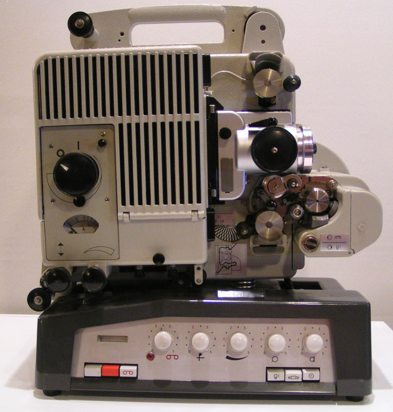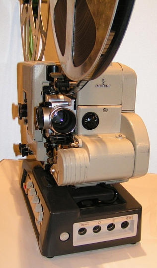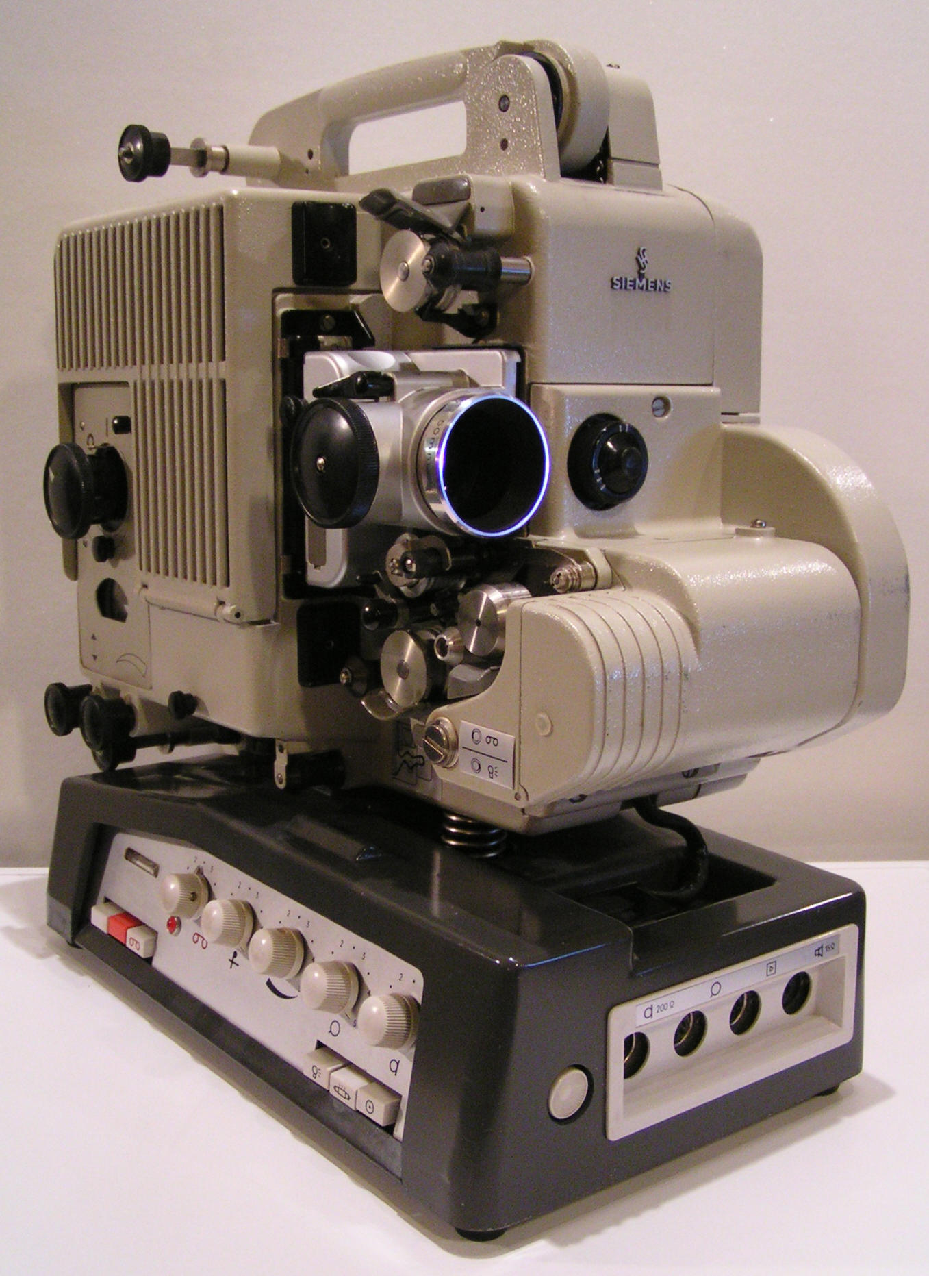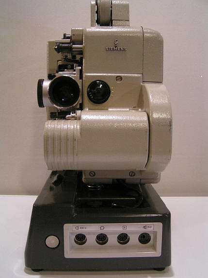 Ein im verhältnismäßig geringer Stückzahl gefertigter Sondertyp ist der Siemens Tonprojektor 2000 mit 12 Watt Sockelverstärker. Durch seine Farbgebung hat er die liebevollen Spitznamen " Bunte Kuh " oder " Albino " bekommen. Es könnte sich auch um eine " White lady " handeln, wenn die Farbgebung nicht grau wäre. Um es genau nach Siemens zu beschreiben, der Projektor ist kieselgrau und der Verstärker lavagrau. Das Greiferschaltwerk mit dem Objektivträger ist silbern. Insofern ist bunt doch ziemlich passend.