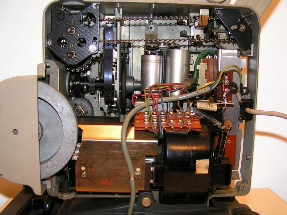 Ein Blick in das Innenleben zeigt auch hier keine Abweichungen zu den grünen 2000-Geschwistern. Der 12 W Transistorverstärker ist zur Licht- und Magnettonwiedergabe sowie zur Magnettonaufnahme geeignet. Er verfügt über mischbare Eingänge für Tonabnehmer, Mikrofon und Tonbandgerät. Die Buchse des Tonbandgerätes kann auch als Dioden-Ausgang genutzt werden.