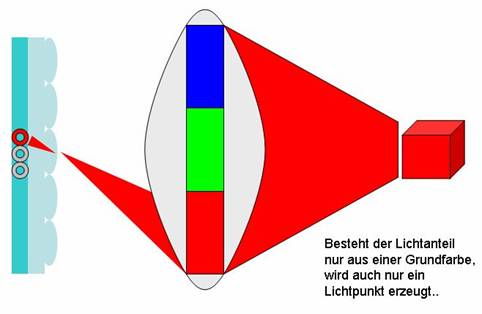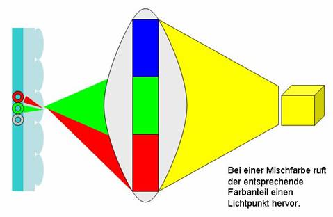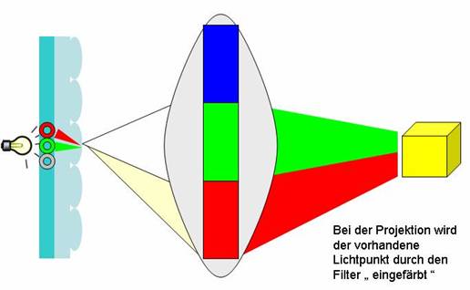 Lichtstrahl zum passenden Farbfilter gelenkt. Auf der Leinwand wird aus den