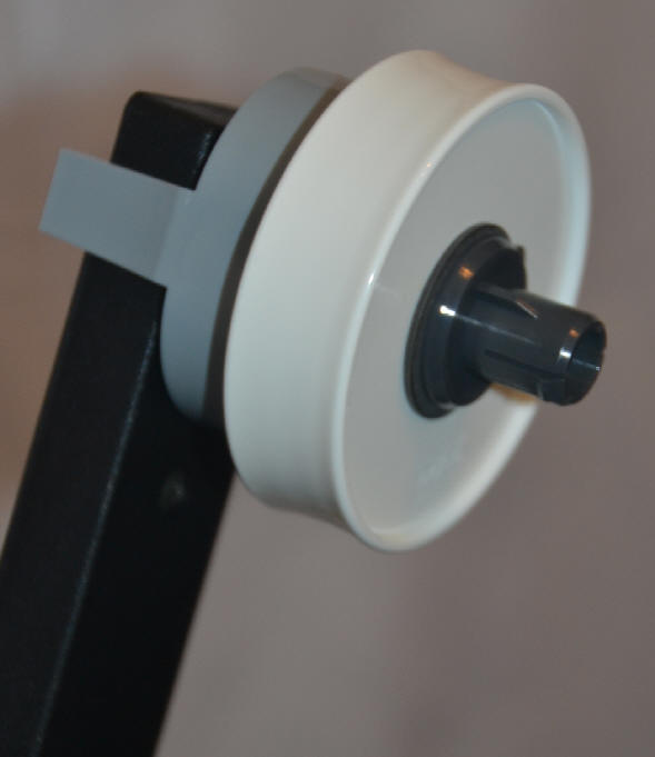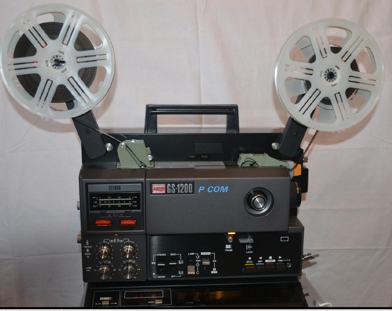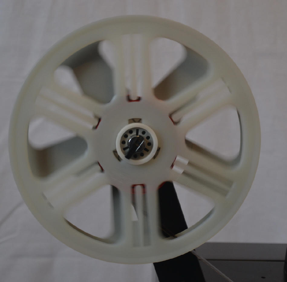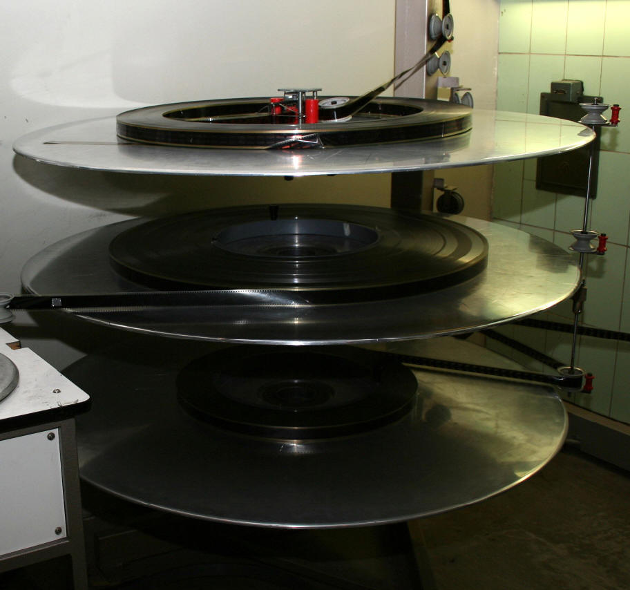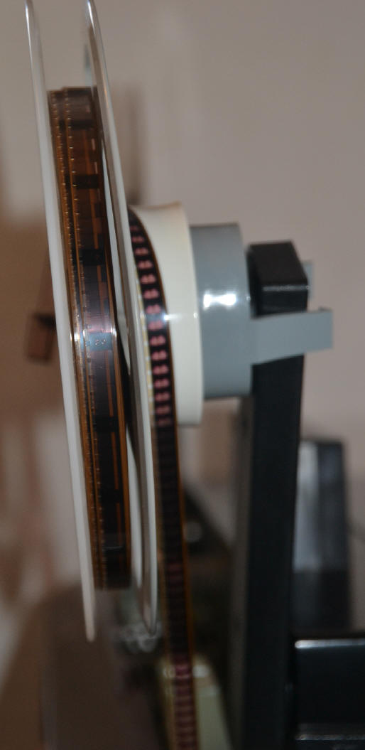 Vergleich zur 35mm Telleranlage: Einsteckeinheit in der Mitte des Filmwickels ist starr, der Film wird durch sie schräg nach oben über Umlenkrollen zum Projektor geführt ~~ die graue Filmspulenseite mit dem roten Filmführer sind ebenfalls starr. Filmteller und weiße Spulenhälfte drehen sich. Der Antrieb und die Geschwindigkeitssteuerung einer Telleranlage ist dann natürlich eine ganz andere Hausnummer Und auf den weißen Schutzring muss ich hier auch unbedingt noch mal eingehen. Bei einer 35mm Telleranlage liegt der Film auf einem horizontalen Teller. Wird der Film aus der Mitte gezogen bleiben die äußeren Ringe im Prinzip einfach liegen. Die “non – rewind –reels“ sind aber ganz normal vertikal am Projektor befestigt. Wird hier jetzt der Film aus der Mitte herausgezogen drücken die äußeren Ringe über die Schwerkraft zur Spulenmitte. Dadurch kann der Film am roten Filmführer haken. Dem wirkt entgegen, dass sich die frei laufenden äußeren Spulen über den weißen Ring abstützen können. Sieht zwar etwas chaotisch bei der Vorführung aus, funktioniert aber prima.