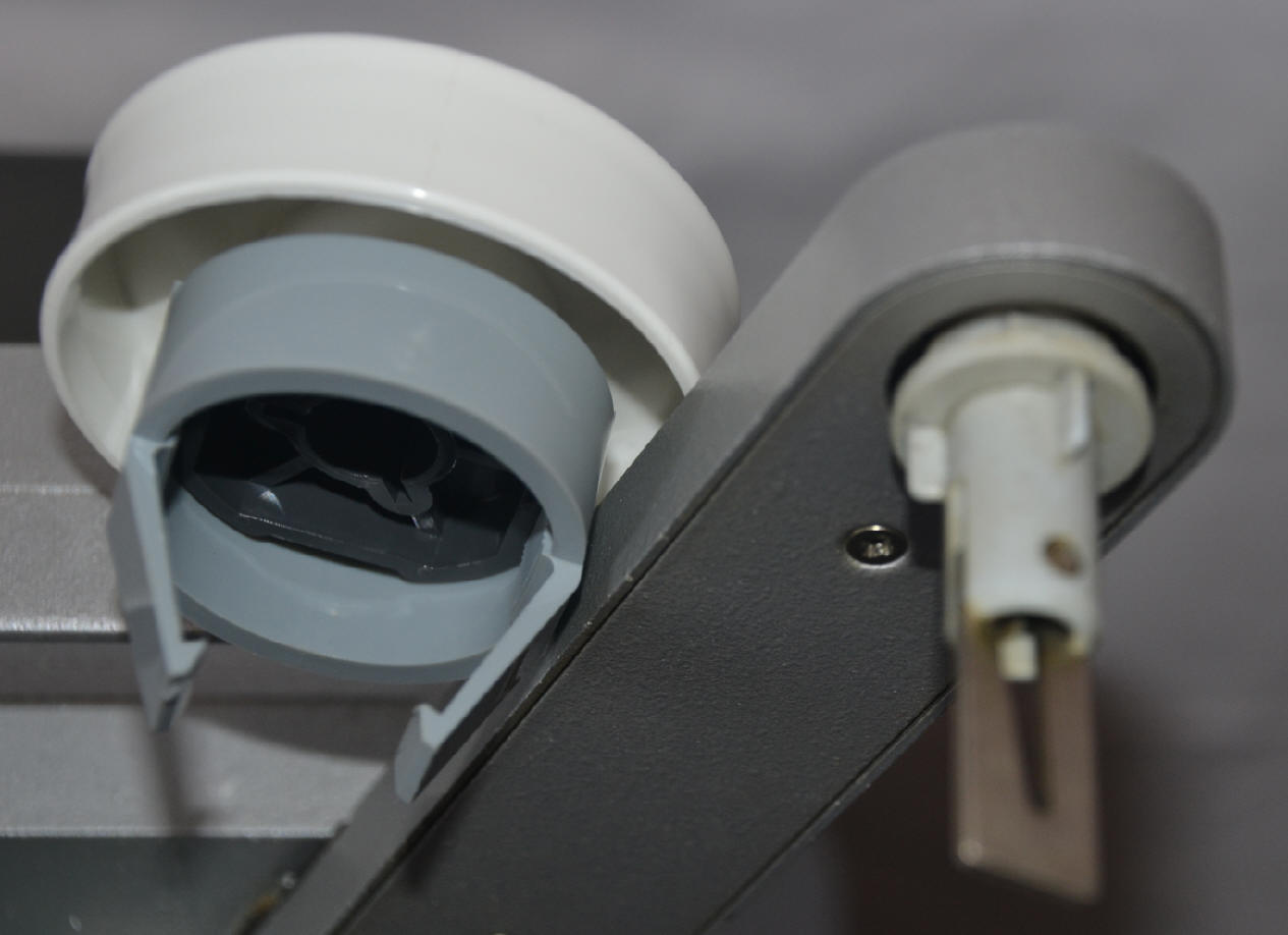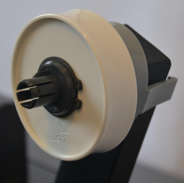 Tja, da begannen die Tücken der Spule. Den Adapter zusammenzustecken war das eine, ihn dann über den Abwickeldorn des Projektors zu bekommen etwas ganz anderes. Vmtl. sind aus dem Kunststoff schon ein paar Weichmacher entschwunden, daher ist die Gefahr etwas abzubrechen recht groß.