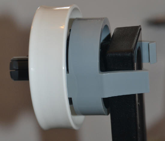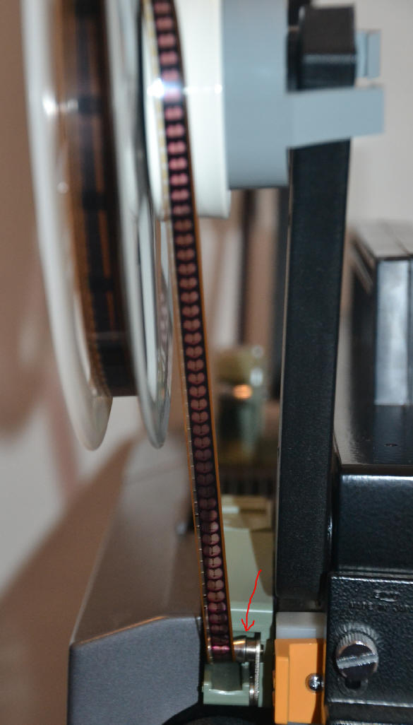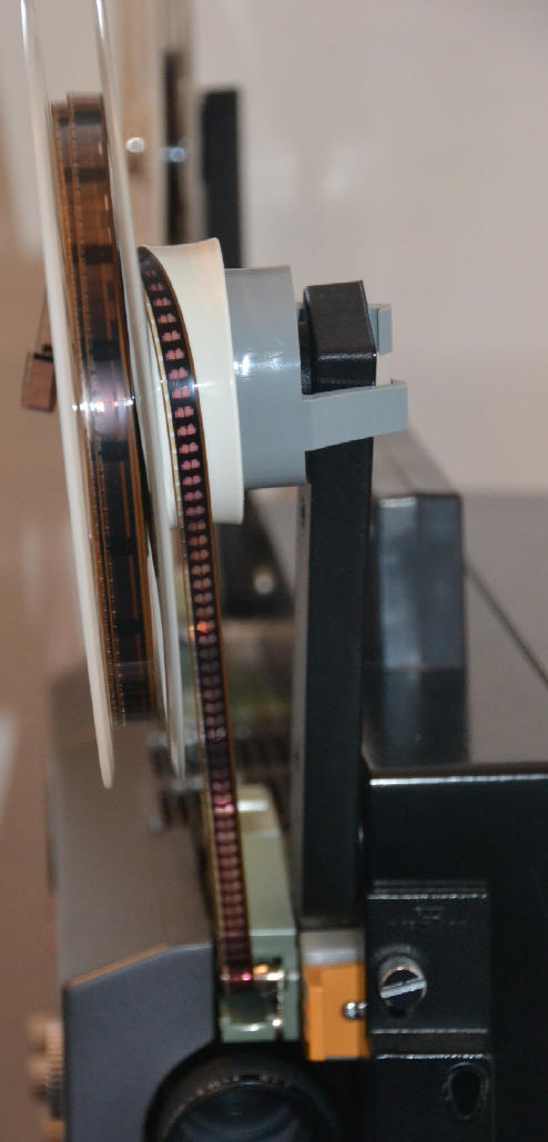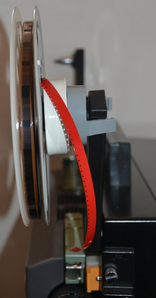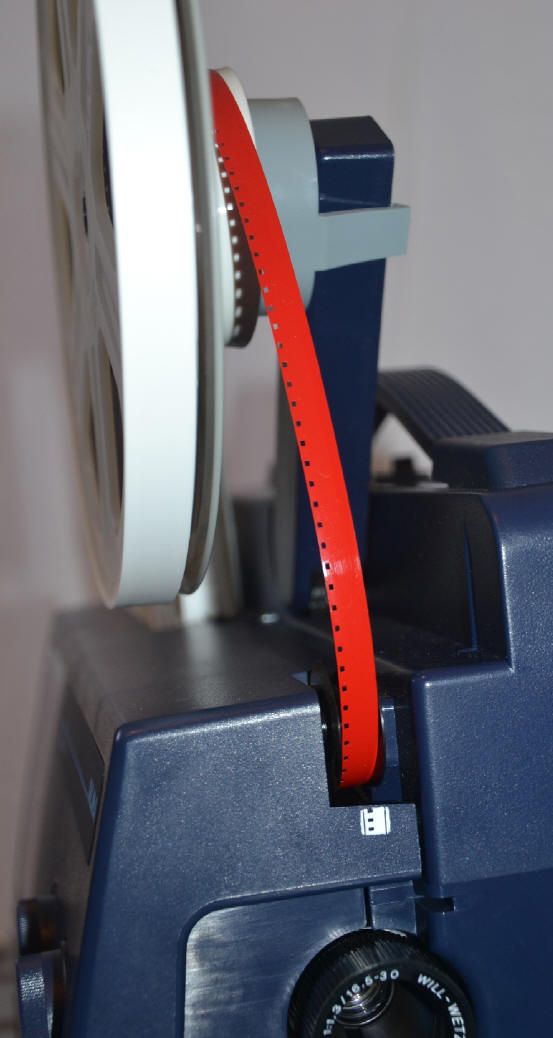 Wenn man dann doch an die Grenzen der Kunstoffbelastung der Adapterhalterung geht, bekommt man auch eine einigermaßen richtige Filmzuführung hin. Das ist auch von Projektor zu Projektor ein bisschen anders. Bei der Vorführung wird dann der Film aus der Mitte der Spule herausgezogen. Dabei wird er von dem roten Filmführer der senkrecht nach oben zeigt geführt. Die vordere weiße Spulenhälfte und der weiße Adapterring drehen sich dabei über die Zugkraft. So wird eine Reibung der Filmlagen untereinander und über den Adapter sehr gering gehalten. Meinen Versuchsfilm habe ich so 10-15 mal durchlaufen lassen ( ohne ihn jemals zurückspulen zu müssen ) – mir sind keine Laufstreifenbildungen aufgefallen. Also insgesamt ist die Funktionalität durchaus gegeben. Besonders wenn man das Prozedere einige male gemacht hat, gehen die Schritte wie von selbst von der Hand. Man bekommt dann auch den weißen Schutzring auf der äußeren Spulenhälfte fixiert, bis er in der Nute einrastet, was sich dann auch sehr positiv auf die Gesamtfunktion auswirkt. Man muss sich diesen Ring schon etwas genauer ansehen und auch richtige herum auf die Spulenhälfte aufstecken. Dieser Teil ist jedes mal ein bisschen tricky, was ich auch dem alternden Kunststoff zuscheide.
