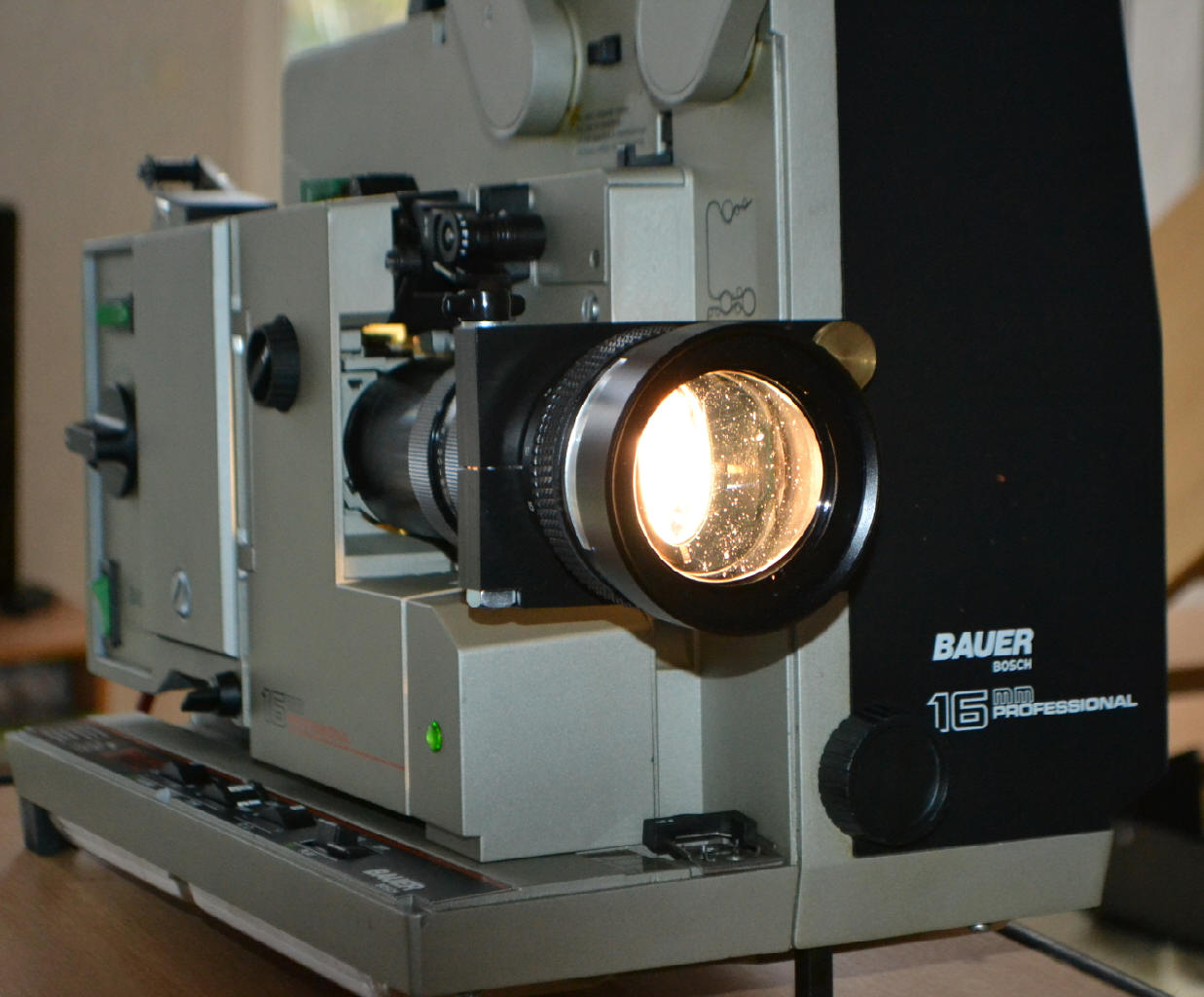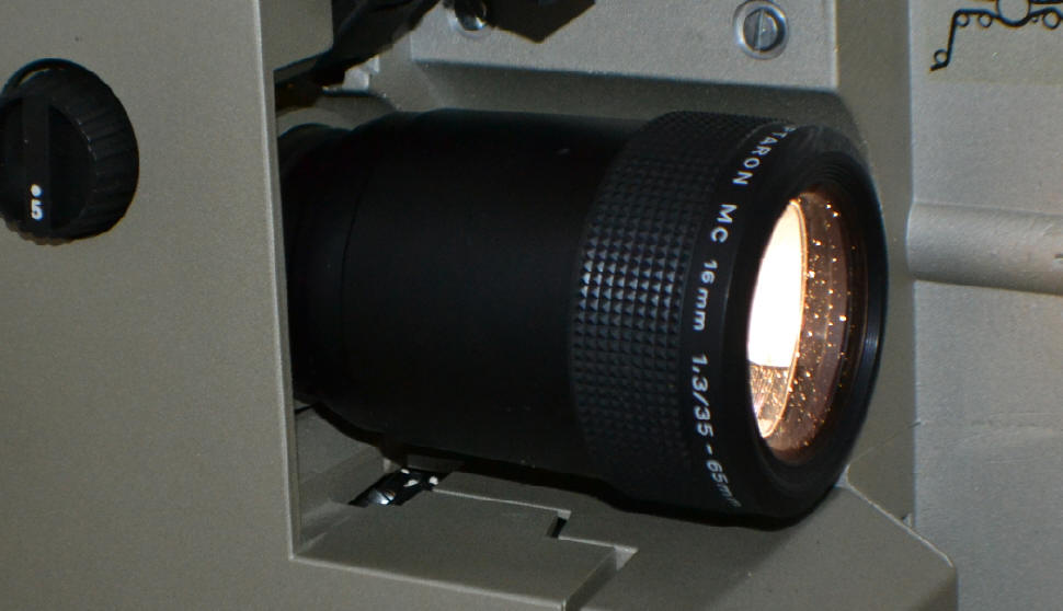 Für die Bauer P6-8 gibt es noch ein ganz besonderes 10mm Objektiv. Mit diesem können auf kurze Distanzen große Bilder projeziert werden. Allerdings werden die Bilder bei "normalen gebrauch" tatsächlich so groß, dass die linke Bildhälfte direkt wieder vom Projektorgehäuse verdeckt wird. Daher muss mit diesem Objektiv auch ein Spiegel genutzt werden. Damit das Bild dann wieder auf der Leinwand seitenrichtig angesehen werden kann, muss die Projektion von hinten durch die Leinwand erfolgen ( Rückprojektion ).