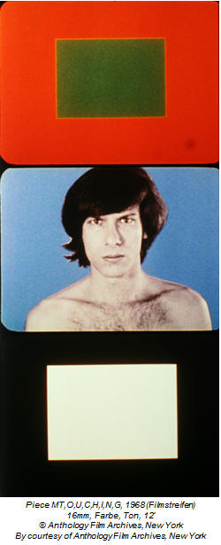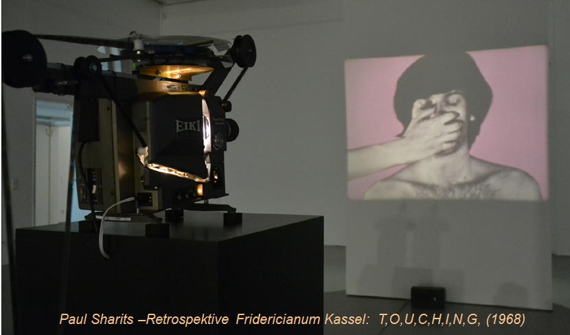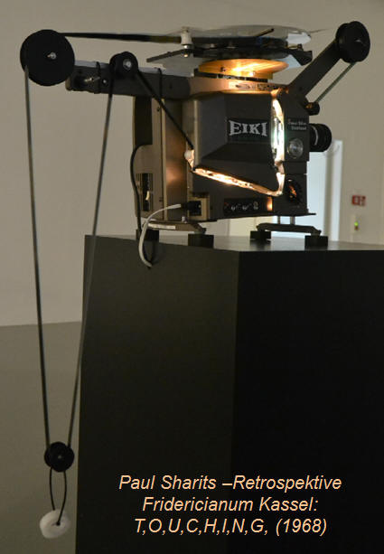 Ein direkter Vergleich von den Frozen Film Frames und einem projizierten Film von N:O:T:H:I:N:G war zwar leider im Fridericianum nicht möglich, aber hier kann dann wieder YouTube hilfreich sein. ( siehe auch am Ende dieser Seite ) Sharits hat sich sehr für Licht und Farben interessiert. Er erforschte unter anderem welche Stimmungen sie im Betrachter hervorrufen. In seinen Filmen liegt daher der größere Focus auf den Farben und der Struktur – die Inhalte sind der Gesamtform eher untergeordnet und werden nur stark reduziert erzählt. In der Ausstellung wurden 7 Filmräume von Sharits gezeigt. Der jeweilige Aufbau wurde dabei von Sharits sehr genau vorgegeben. Projektorabstände, Leinwandgröße, Ausrichtung des Raums (Epileptic Seizure Comparison) und Lautsprecherstandorte sind exakt vom Künstler festgelegt. So wurde auch die etwas eigenartige Filmführung (mit der herunterhängenden beschwerten Rolle) für T,O,U,C,H,I,N,G, (1968) übernommen.