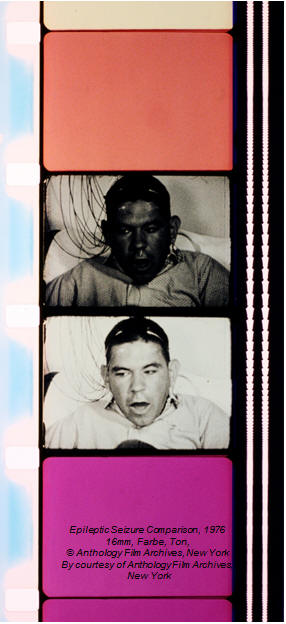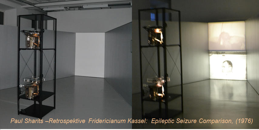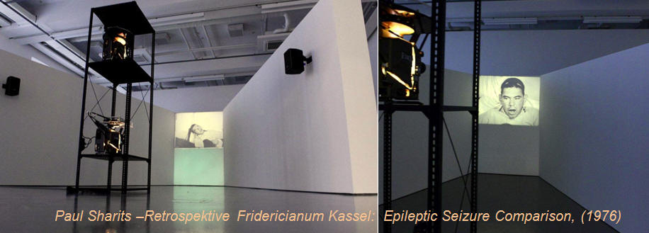 Passenderweise hat sich Sharits dieser Thematik 1976 in seinem Werk Epileptic Seizure Comparison angenommen. Diese Doppelprojektion lief bereits auch während der documenta 6 (1976). Sie wurde, wie auch hier vom Künstler vorgegeben, in einem trapezförmigen Raum gezeigt. Man konnte sich der beklemmenden Darstellung nur sehr schwer entziehen. Im Gegenteil, durch die Raumgebung, mit den daraus entstehenden Lichtreflexionen, wurde man quasi in die Bilder hereingezogen. Man fühlte sich als Voyeur und die Gedanken schweiften durchaus sehr weit ab.