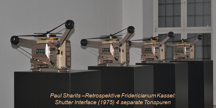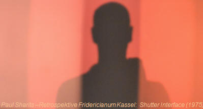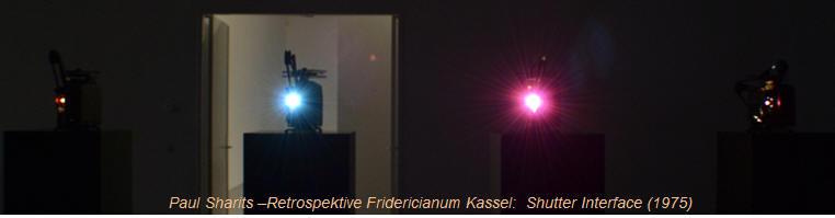 In T,O,U,C,H,I,N,G, , Epileptic Seizure Comparison und Piece Mandala/End War spürte der Betrachter eine gewisse Gewaltausstrahlung der Filme - sowohl körperlich (anstrengend für Auge und Ohren) als auch über die psychische Wirkung. Man wollte/musste sich entziehen, um kurze Zeit später dann doch (fast zwanghaft) zurückzukehren. Wirklich sehr emotional. Besonders gut gefallen haben mir die unterschiedlichen Mehrfachprojektionen. Der Gedanke, dass durch die unterschiedlichen Looplängen und rein zufällig gewählte Startpunkte der Projektoren wirklich einmalige, nicht reproduzierbare, Momente entstehen ist weiterhin faszinierend. Blickpositionen hinter, neben oder zwischen den Projektoren ergaben ein spannendes Zusammenspiel zwischen Technik und Kunst. Dabei war auffallend, dass die Projektoren in den einzelnen Filmräumen sehr unterschiedliche Ausrichtungen und Positionen zur Leinwand hatten. Da es ausdrücklich erlaubt / gewollt war auch vor die Projektoren zu treten, konnte man in das Kunstwerk eingreifen und Teil desselbigen werden. Für den Gesamteindruck darf, gerade für Schmalfilmfreunde, der Projektorensound natürlich nicht unerwähnt bleiben. In Shutter Interface (1975) befanden sich alle 4 Projektoren in gleichem Abstand zur Leinwand, die Bilder überschnitten sich leicht und es wurden die 4 separaten Tonspuren genutzt.