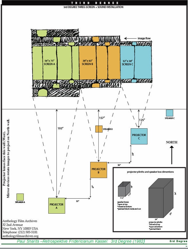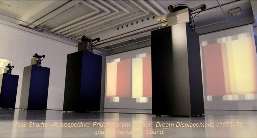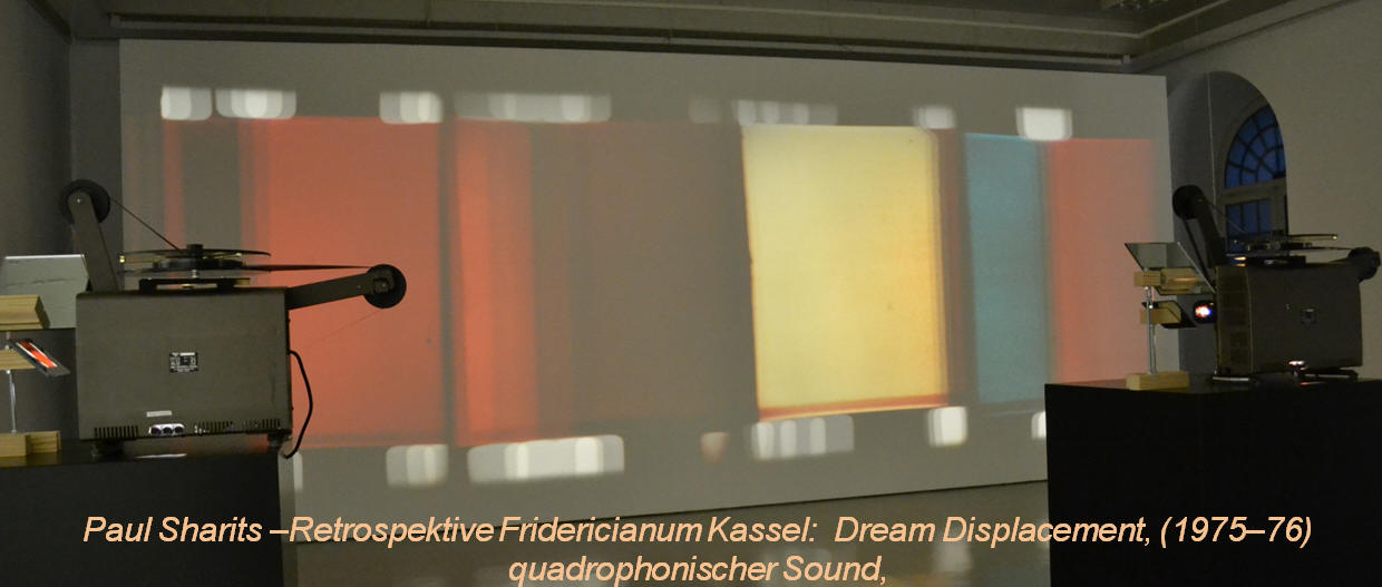 Die gezeigten Mehrfachprojektionen verdeutlichten sehr schön was Sharits in „Notes on Film“ geschrieben hat :“Ich möchte mich von Imitation und Illusion abwenden und mich direkt in das höhere Drama des Zelluloids begeben, der zweidimensionalen Filmstreifen; der einzelnen rechteckigen Filmkader; der Beschaffenheit von Transportlöchern und Emulsionen; des Betriebs von Projektoren; des dreidimensionalen Lichtstrahls; der Raumausleuchtung; der zweidimensionalen reflektierenden Leinwandoberfläche; der Leinwand von Netzhaut, Sehnerv und individueller psychophysischer Subjektivitäten des Bewusstseins.“ siehe auch: http://mikehoolboom.com/?p=39#essay_444