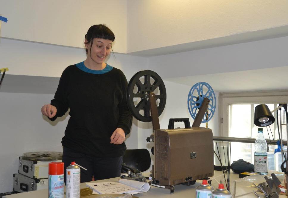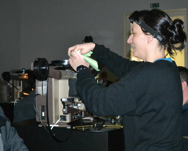 Dabei gab es natürlich auch viel Interessantes zu erfahren. Die Filmloops halten viel länger durch als erwartet. Der 3‘45‘‘ Wordmovie hat fast 2 Monte ohne Filmriss und zu vielen Laufstreifen durchgehalten. Die Filme sind recht kompliziert zu schneiden – alle Kopien (einer Mehrfachprojektion) kommen auf einem Bobbi. Diese richtig zu trennen und wieder als Loop neu zu kleben bedarf guter Vorbereitung und konzentriertem arbeiten. Entgegen “normaler“ Filme sind die Farb-Frames nicht so leicht zu identifizieren. Der technische Leiter berichtete, dass die analoge Technik sehr stabil lief – entgegen manch anderem Projekt mit PC und Beamer.