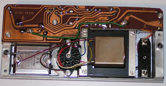 Über diese Kontakte kann eine 7,5 W Zusatzendstufe angesteckt werden. Da der Projektor damit über einen vollwertigen 7,5 W Verstärker verfügt, hat er auch wieder die FWU Schulzulassung erhalten. Dies war eher zum Nachrüsten gedacht, da es vmtl. billiger war gleich einen Projektor mit der höheren Verstärkerleistung zu beschaffen. Hatte man allerdings bereits eine 2 W Version, so konnte dieser Nachrüstsatz natürlich durchaus eine effektive Möglichkeit zur benötigten Leistungssteigerung sein. Da die Zusatzendstufe sicher nicht als externes Anhängsel (mit den daraus resultierenden Nachteilen wie schnelle Verlust - / Beschädigungsmöglichkeiten) akzeptiert worden wäre, gab es diese sehr pfiffige Lösung. Zum Nachrüstsatz gehörte nicht nur der eigentliche Verstärker, sondern auch das Rückwandoberteil - als Ersatz für die Kabelaufwicklung - und ein Montagesatz für den geänderten Netzanschluss über einen Heißgerätestecker.