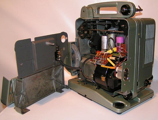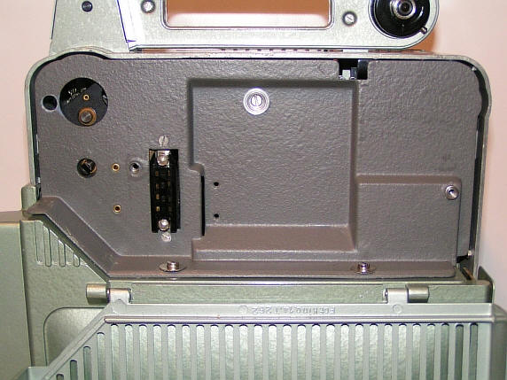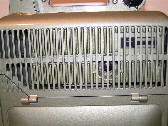 Über diese Kontakte kann eine 7,5 W Zusatzendstufe angesteckt werden. Da der Projektor damit über einen vollwertigen 7,5 W Verstärker verfügt, hat er auch die FWU Schulzulassung erhalten. Dies war eher zum Nachrüsten gedacht, da es vmtl. billiger war gleich einen Projektor mit der höheren Verstärkerleistung zu beschaffen. Hatte man allerdings bereits eine 2 W Version, so konnte dieser Nachrüstsatz natürlich durchaus eine Effektive Möglichkeit zur benötigten Leistungssteigerung sein. Da die Zusatzendstufe sicher nicht als externes Anhängsel ( mit den daraus resultierenden Nachteilen wie schnelle Verlust - / Beschädigungsmöglichkeiten ) akzeptiert worden wäre, gab es diese sehr pfiffige Lösung. Zum Nachrüstsatz gehörte nicht nur der eigentliche Verstärker, sondern auch das Rückwandoberteil - als Ersatz für die Kabelaufwicklung - und ein Montagesatz für den geänderten Netzanschluss über einen Heißgerätestecker. Und jetzt der Projektor aus der interessanteren Perspektive :