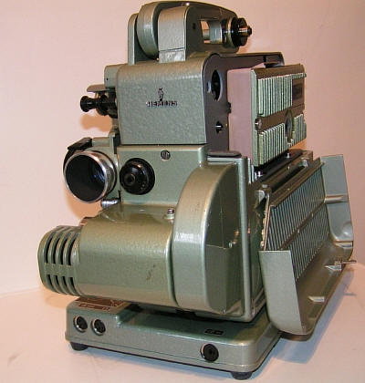 Dieser Projektor hat den relativ seltenen 2 W Transistorverstärker in seinem sehr flachen Projektorfuß "versteckt". Durch die geringe Leistung wurde er für die Verwendung in Schulen nicht zugelassen.