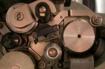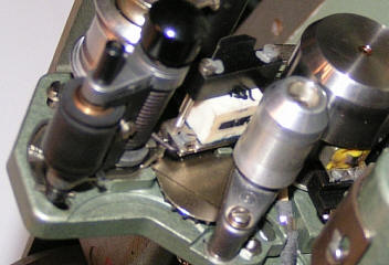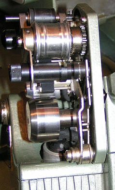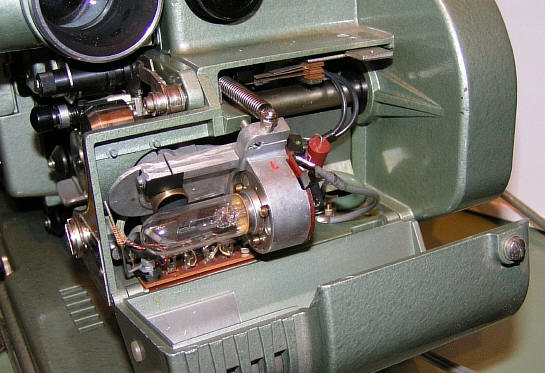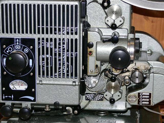 Auch die Tonlaufwerke für die Magnettonabtastung können einfach nachgerüstet werden. Diese Laufwerke haben neben den Magnettonköpfen auch die zusätzlichen Führungsrollen und die Schwungmasse auch eine Tonlampe, Tonoptik und eine Fotozelle und können somit auch Lichtton abtatsten. Sehr schön ist hier das Tonteil für Licht- und Magnetton erkennbar. Die abzutastende Spur wird hier