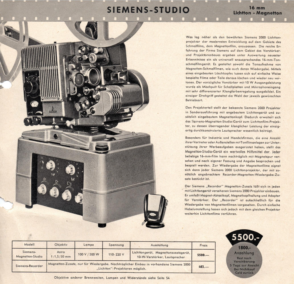 Interessant ist, dass in dieser (keine zeitliche Zuordnung möglich) Anzeige ( vmtl. Teil ein Fachzeitschrift) auch von einem "Siemens-Studio" gesprochen wird.