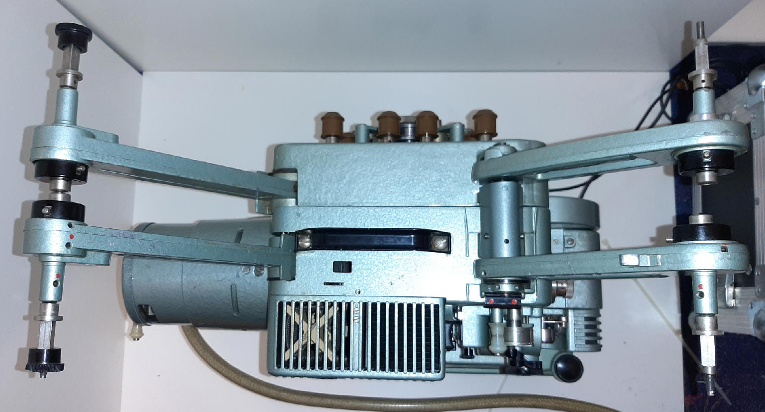 Auffallend, gegenüber den Werksfotos (und den weinigen anderen mir bekannten Bildern) ist die doppelte Ausführung der Spulenarme, also nicht ein Arm mit zweiseitiger Aufnahmemöglichkeit. Sie sind auch nicht einklappbar - was zumindest bei dem hinteren wohl auch bei den anderen Ausführungen nicht gehen wird :-). Der Transportkoffer ist dementsprechend groß.