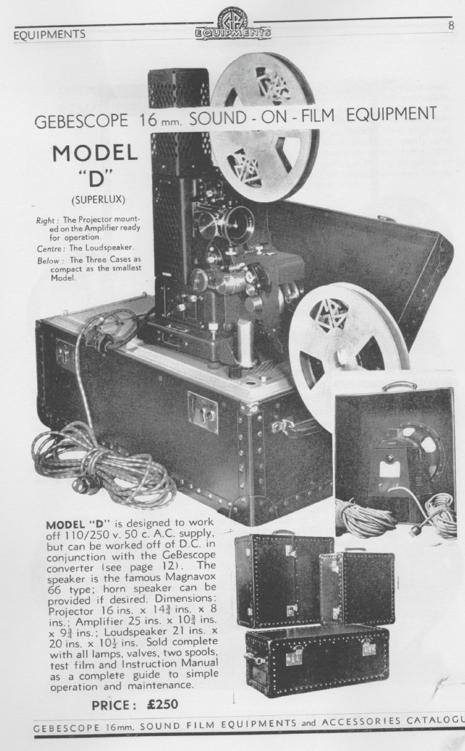 1934 In this year G.B. Equipments introduced the following Models, using the D.I.N. Standard: HOME (later to become Model ‘A’-Type H.M.P.) STANDARD (later to become Model ‘B’-Type S.M.P.) (Each of these had their spools, feed and take-up, within the casing, only offering external greater capacity arms outside the casing as an optional accessory manufactured by a separate Company) In order to screen films with the SMPE sound track they offered a ‘Prism Attachment’ to reverse the film when projected on the screen. Later that year they offered MODEL ‘C’ (Type B.A.C.) which was a Siemens STANDARD Projector with a B.A. (British Acoustics) sound head, and a MODEL ‘D’ (Superlux) which was a modified Siemens ‘Superlux’ (Grossraum) projector, again with a B.A. sound head. The price of the latter 250.00 GBP. Each of these two models were ‘modified’ Siemens projectors which were mounted on their Amplifier cases, similar to the Siemens models offered in Germany with KLANGFILM sound heads and mounted on base Amplifier cases. The modifications involved fitting a separate motor on/off control, fitting a mains voltage neon lamp to illuminate a stroboscope pattern on the fly-wheel to regulate the sound speed of 24 fps and modifying the large projector lens unit to accept an internal sleeved regular Siemens Dallmeyer 50mm lens instead of the more expensive Astro-Kino lens (three times the cost), and lastly an internally modified ‘tilting’ arrangement where the two controls are linked by chain so that either knob can lower or elevate the position of the projector. 1935 From this year the projectors offered by G.B. Equipments Ltd. were known as ‘Gebescopes’. 1936 As stated previously, in March of this year agreement was reached to only use the SMPE Standard sound head system so the BA Sound Head was available in the new design as well as in the D.I.N. Standard G.B. Equipments also manufactured a SILENT version of their Model ‘A’ projector during this year. 1938 By this year they were manufacturing the following: Model K16 (200W lamp, 4W Amplifier), Model L16 (200W lamp, 8W Amplifier), Model H16 (200W lamp, 23W Amplifier based on a Bell & Howell unit) Model S16 (200W lamp) Silent Model.