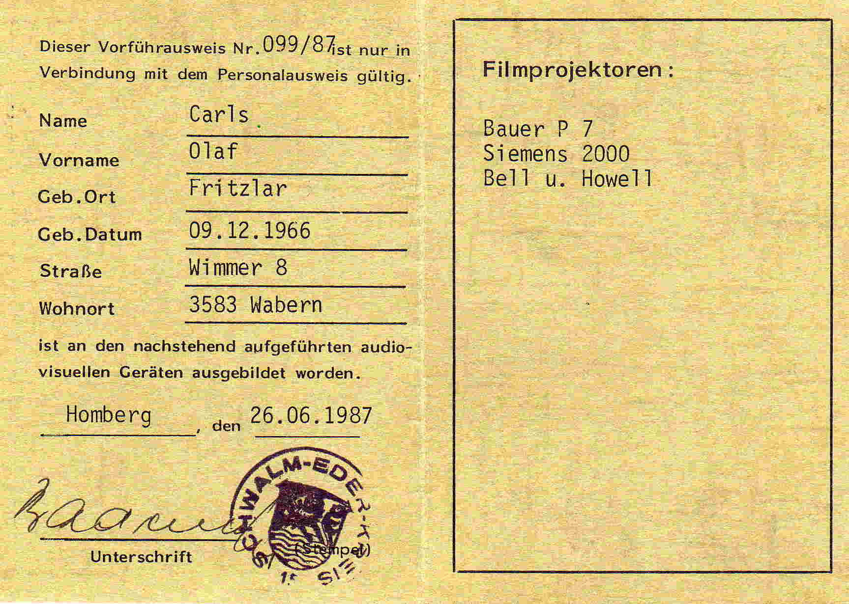 Und irgendwann hab ich dann auch den Vorführschein gemacht. Damit war man berechtigt, Projektoren und Filme bei der Filmbildstelle ( in Homberg ) auszuleihen.