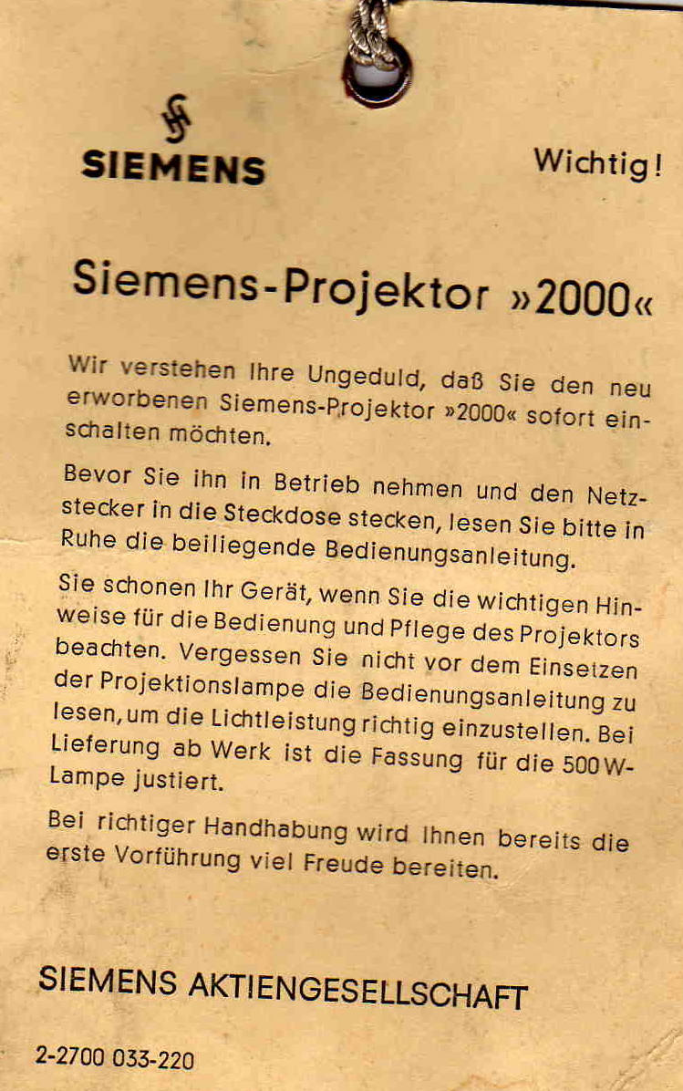 Der Siemens-Projektor 2000 wurde von 1952 bis ca. 1969 in den verschiedensten Variationen gebaut. Mit der Exceltabelle " Siemens Projektor 2000 - Produktübersicht " habe ich einen entsprechenden Überblick zusammengestellt. Diese Tabelle ist sicherlich nicht vollständig und wird nach und nach auch erweitert. Viele Schmalfilmfreunde sind heute nicht mehr so begeistert von dem Siemens Projektor 2000. Zu laut und schlechter Ton wird da immer mal wieder angeführt. Ich bin da etwas anderer Meinung ! Ok, der Vorwiderstand ( je nach Ausführung ) geht auch gut und gerne als mittlerer Heizlüfter durch. Die Geräuschentwicklung ist schon etwas höher und Asbest wurde wohl auch verarbeitet. Aber wir reden hier von einem technischen Gerät, das Anfang der 1950er Jahre entwickelt und erstmals in großer Stückzahl produziert wurde. Die vielen Kombinationsmöglichkeiten sowie die robuste Bauart lässt doch Rückschlüsse auf die Genialität der Entwickler zu. Und er läuft heute noch ! Und er sieht immer noch gut aus ! Ist es fair ihn mit Projektoren zu Vergleichen, die 30 Jahre später gebaut wurden ? Und wenn er rattert, so ist das für mich Geschichte und eine liebe Erinnerung zugleich !