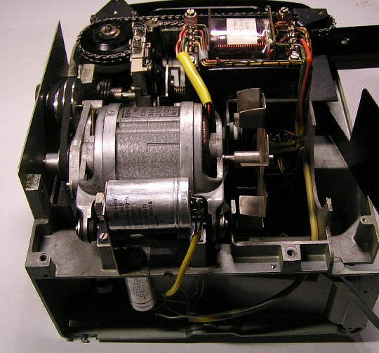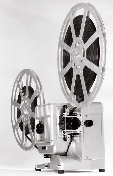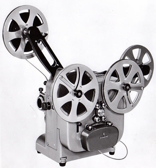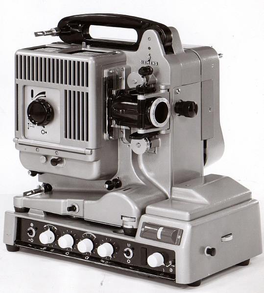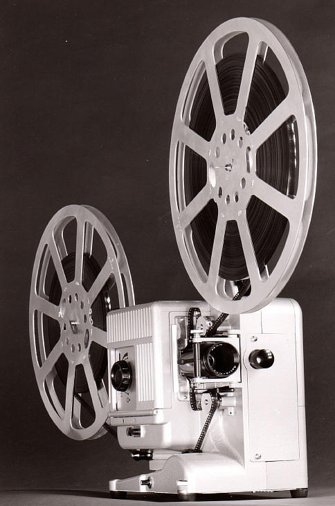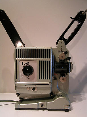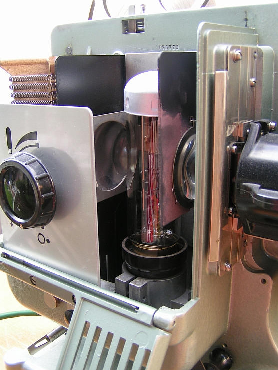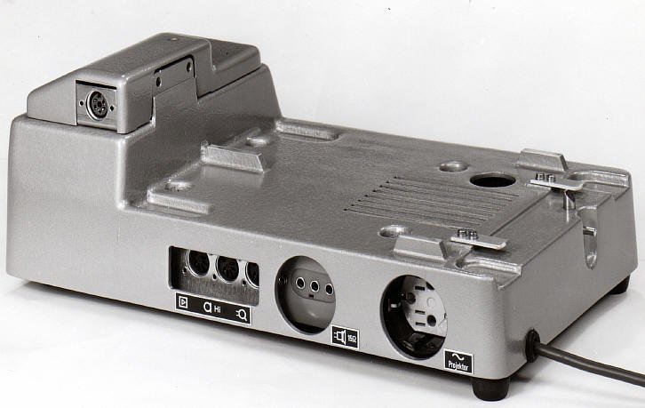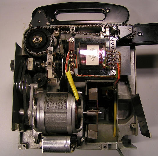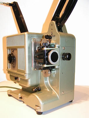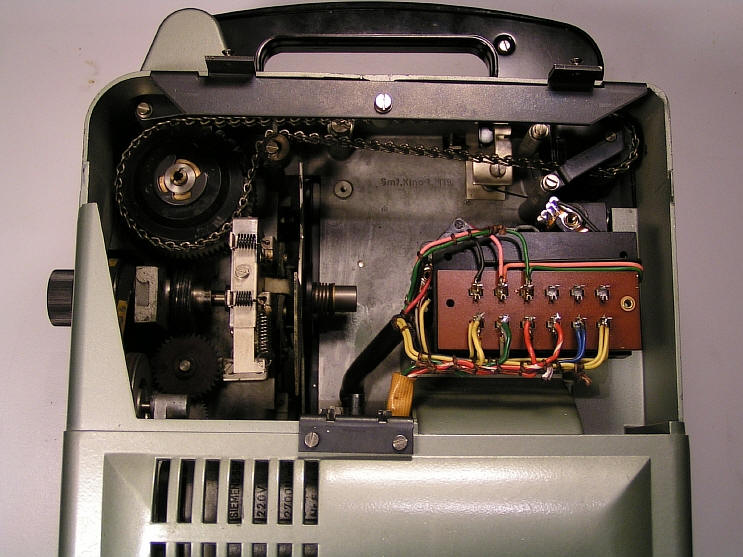 Alleine durch die grüne Hammerschlaglackierung ist die Verwandtschaft zu dem großen Bruder ( Projektor 2000 ) erkennbar. Aber auch das Bedienelement und das Prinzip der Antriebstechnik ist unverkennbar an das 16mm "Vorbild" angelehnt. Ach ja, es handelt sich bei dem P800 natürlich um einen 8 mm Projektor.