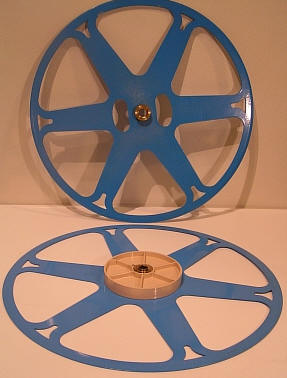Einen auf Bobby ( Kunststoffkern ) gewickelten Film kann man nicht direkt auf einem Projektor vorführen. Um ihn aber nicht erst umspulen zu müssen, kann eine solche Steckspule verwendet werden. Der Film wird einfach zwischen die beiden Hälften gelegt. Die Hälften werden dann miteinander verschraubt, und schon kann die Vorführung beginnen. Natürlich kann so auch ein Film auf den Bobby gewickelt werden.
