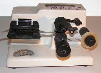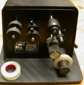 Mit diesem Cinecare ist es möglich die Perforation eines Filmes ( 16 oder 35 mm ) zu reparieren. Ein spezieller Tesafilm ( mit Löchern wie bei der Perforation ) wird damit Lochgenau aufgeklebt. Ein nicht ganz günstiger Spass, der sich nur bei wertvollen Kopien und größeren Beschädigungen lohnt. Kleinere Perfoschäden kann man auch mit der Trockenklebepresse ausbessern.