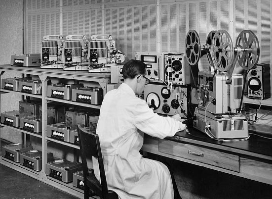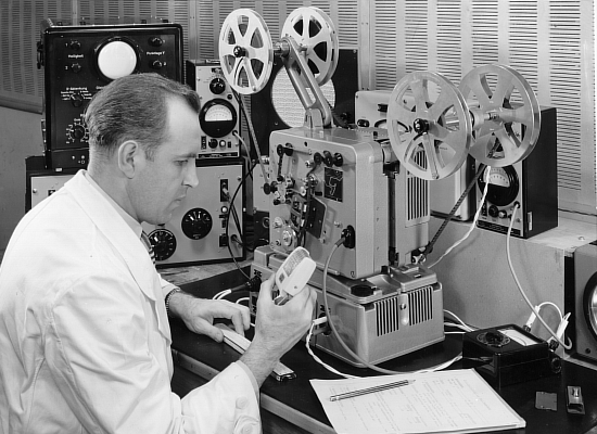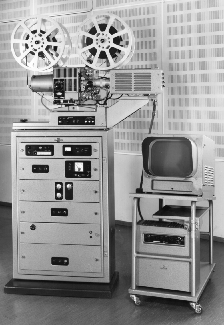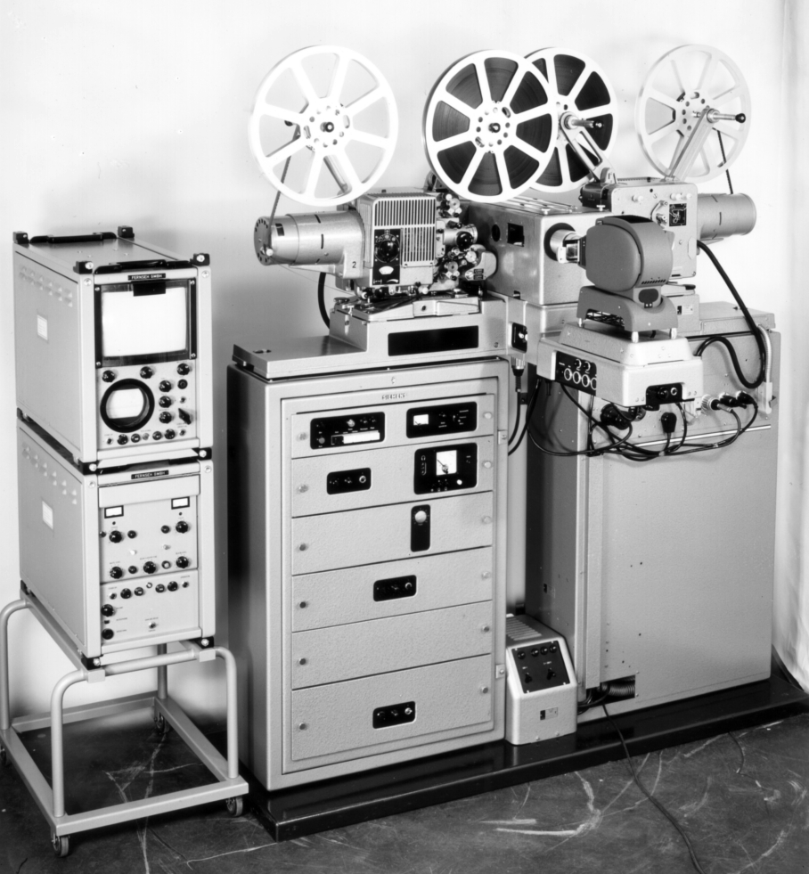 Fernseh - Filmabtaster für 16mm Filme bestehend aus Siemens Projektor 2000 in Zweibandausführung mit Synchronmotor und Siemens Vidikon Kamera.
