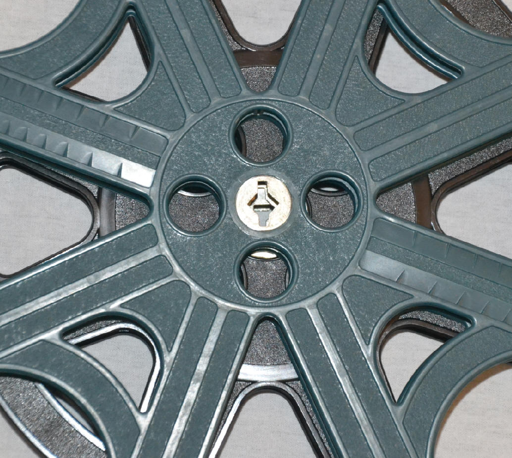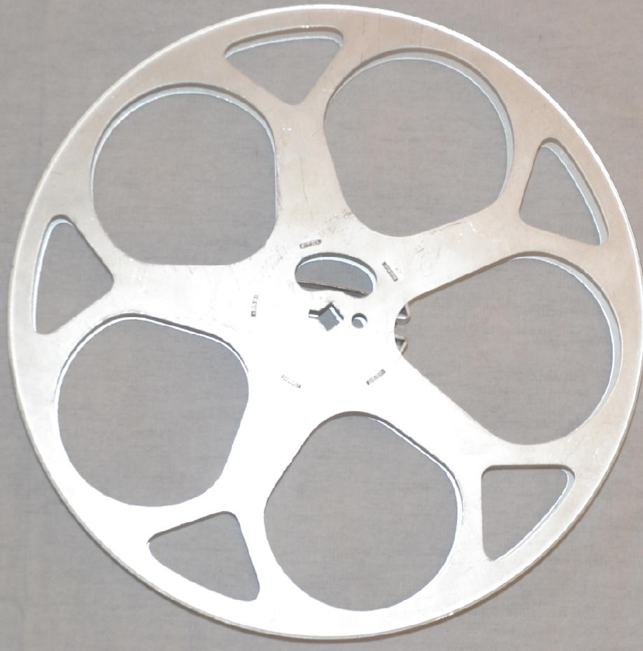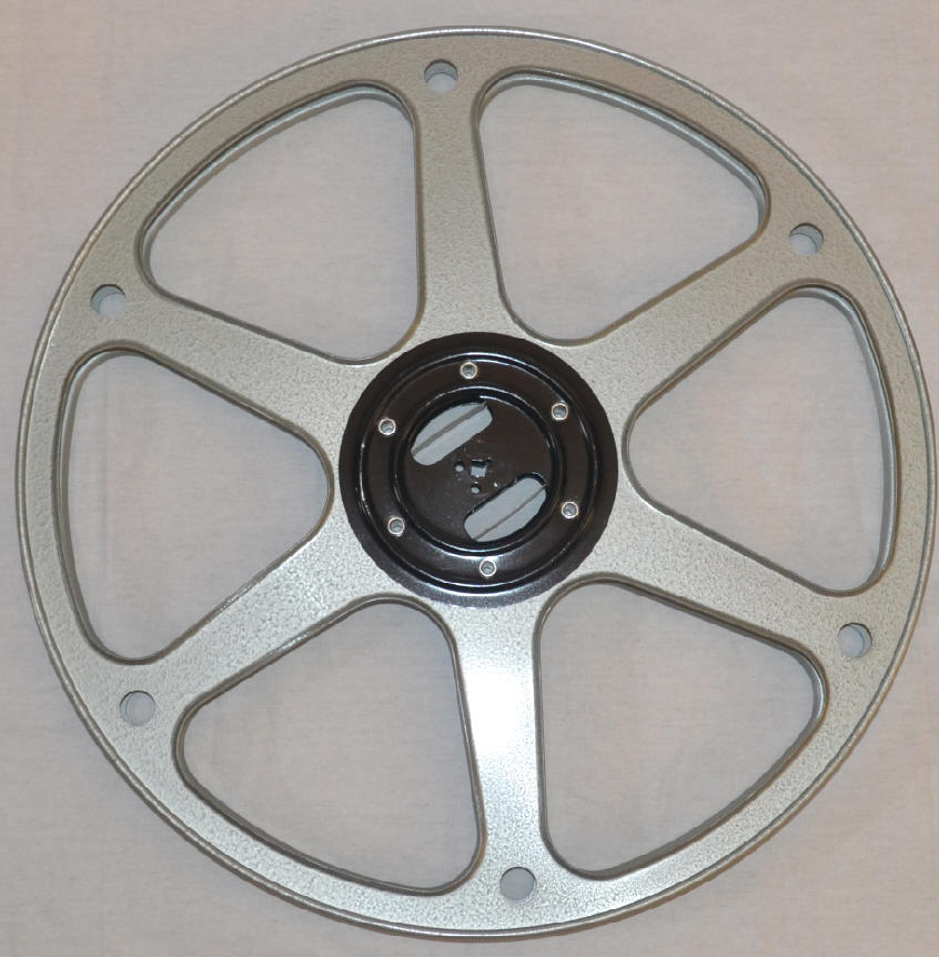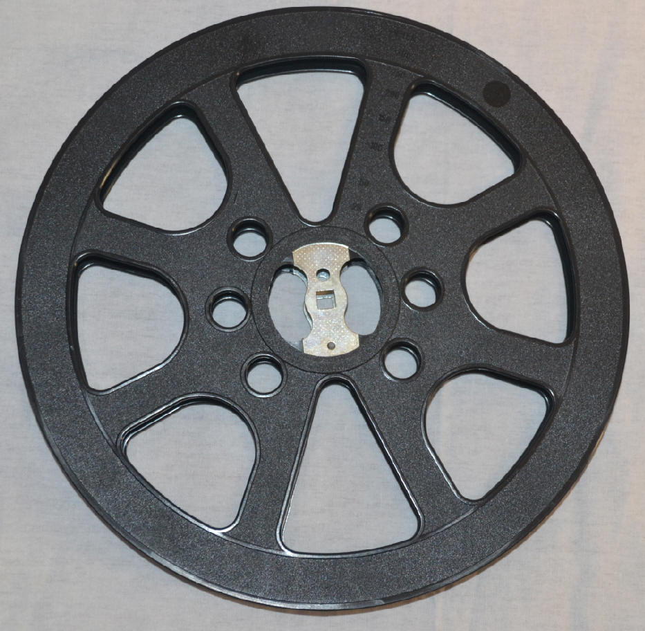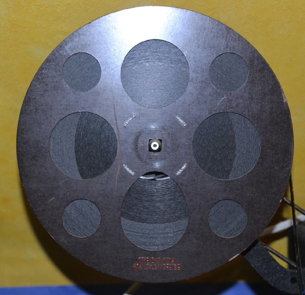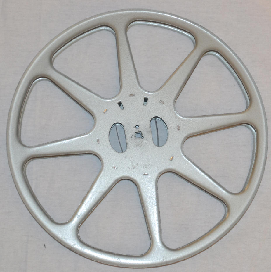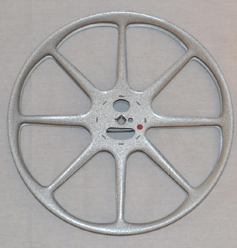Diese "Steck"-Spule ist teilbar. Damit kann ein Film, der auf einem Bobby aufgespult ist, umgerollt (oder direkt vorgeführt) werden,