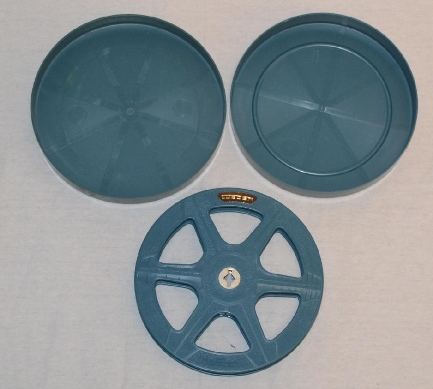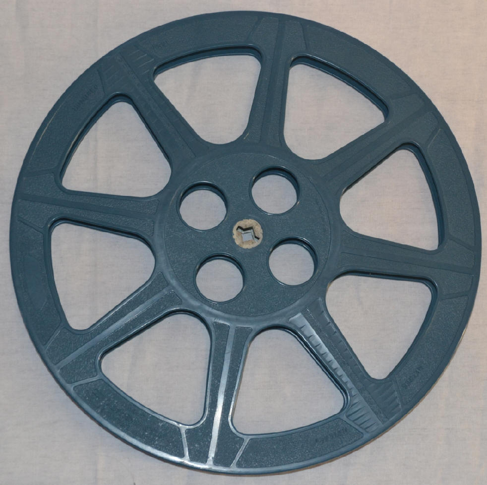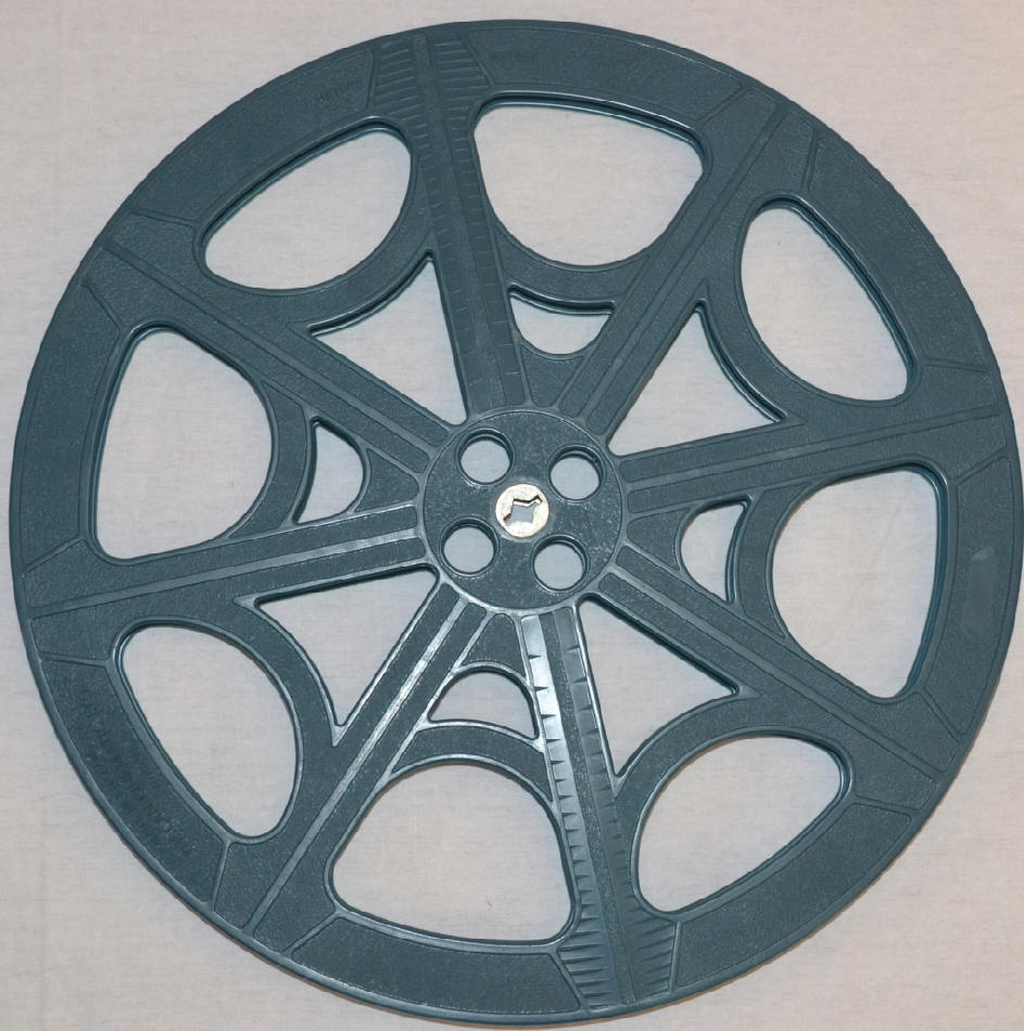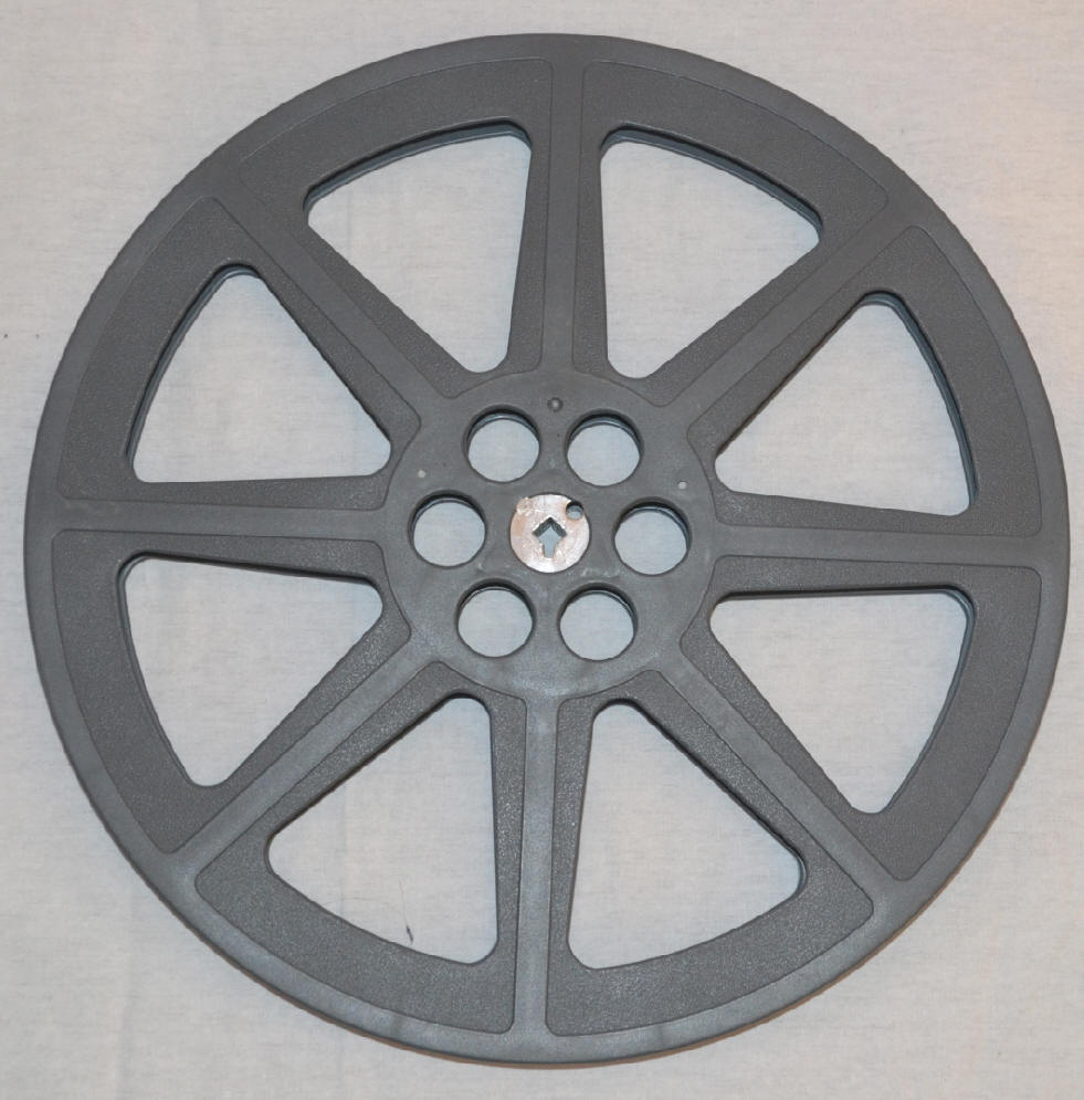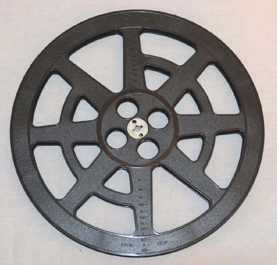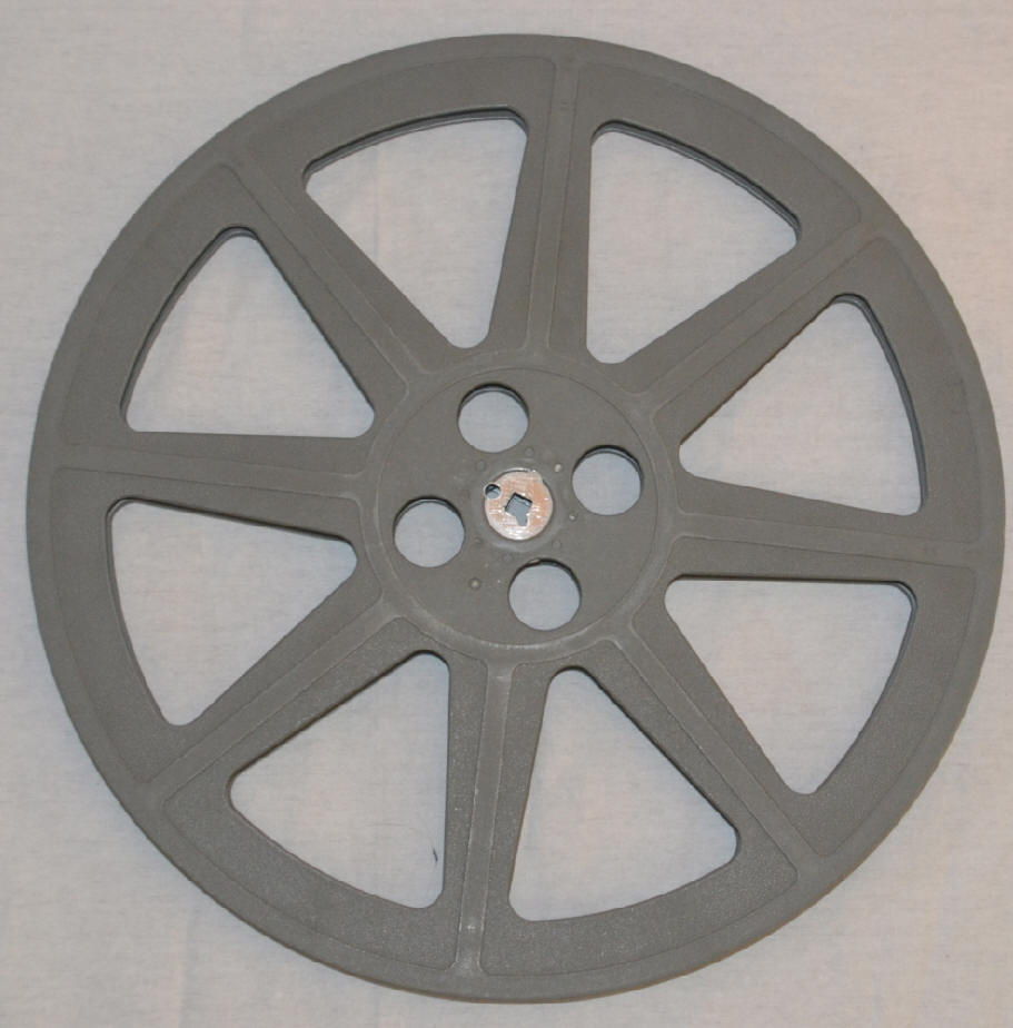 Diese "Steck"-Spule ist teilbar. Damit kann ein Film, der auf einem Bobby aufgespult ist, umgerollt (oder direkt vorgeführt) werden,
