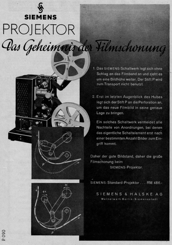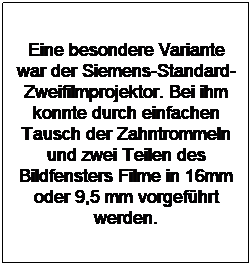In vielen baugleich mit dem Heimprojektor, allerdings mit einer 60% höheren Lichtleistung und Lüftungsschlitzen in Rautenform, ist der Siemens Standard-Projektor. Im Gegensatz zum Heimprojektor der mit einem Einzahngreiferschaltwerk ausgerüstet ist, hat der Standardprojektor das spezielle Siemens-Schaltwerk. Dieses Schaltwerk ist mir nur an diesem Projektor bekannt. Siehe auch Zeitungswerbung ganz unten.
