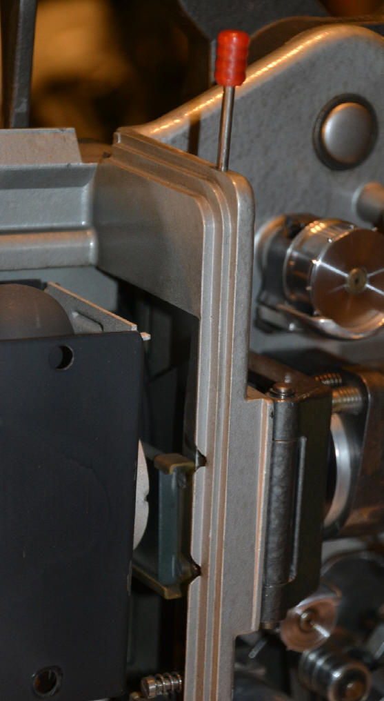 Ein (Wärmeschutz) Filter kann manuell im Strahlengang eingeschoben werden. Dieser ist auch mit einem Kontakt verbunden