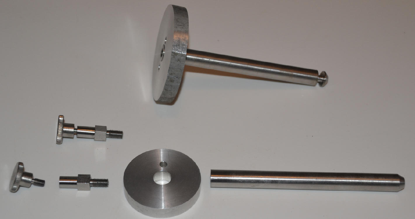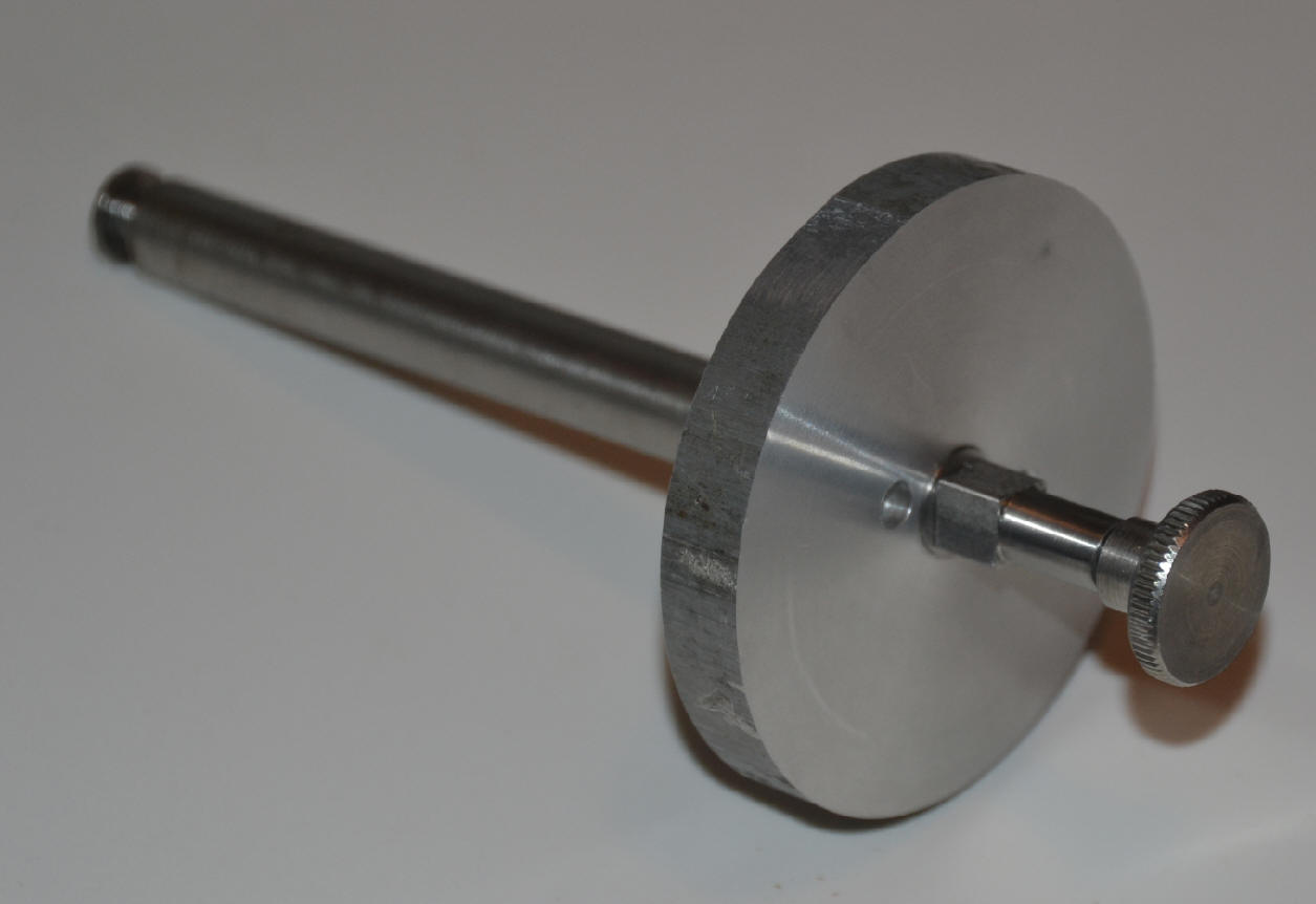 Dann habe ich die Achsen mit LOCTITE Fügeklebstoff in die zentrierte Bohrung der Scheiben eingepresst. Ebenfalls mit Fügekleber wurde der Aufnahmedorn im Gewinde, sowie der Mitnehmerdorn in der Bohrung, gesichert. Aushärten lassen und fertig.
