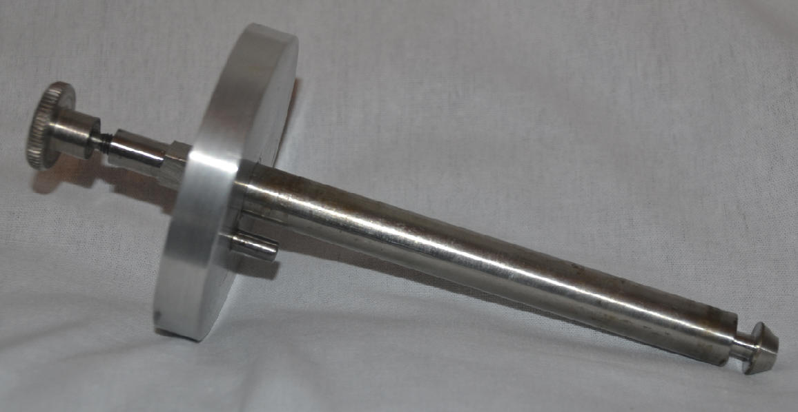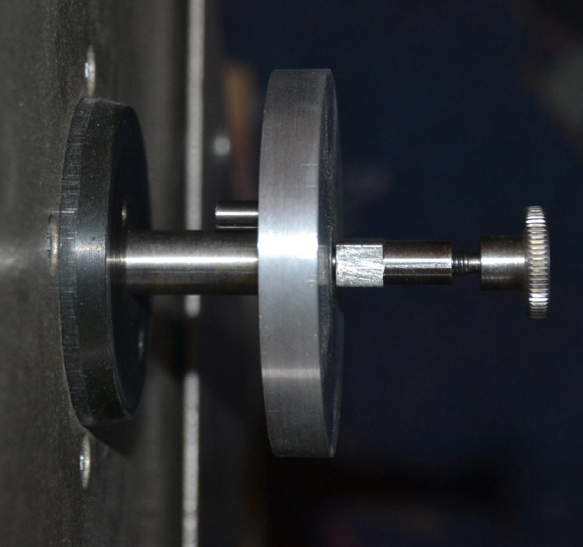 Wohl dem der eine Drehbank hat, mir hat dabei ein Bekannter geholfen. Zunächst die Achse mit der Sicherungsnut gedreht. Und auf der Drehbank bekommt man auch ganz leicht ein zentriertes Innengewinde geschnitten. Und wo wir schon mal dabei waren, gleich noch schnell in meine 75 mm Scheiben zentrierte Löcher für die Achse und Löcher für den Mitnahmedorn (zur Kraftübertragung von der angetriebenen Scheibe auf die Spulenachse) gebohrt. Dann noch den 8 mm Vierkantstahl auf der einen Seite „abgerundet“ und wieder ein Innengewinde geschnitten. Auf der anderen Seite fehlte nur noch ein Außengewinde und alle Bauteile waren fertig. Die Rändelschraube bekommt man im Handel.