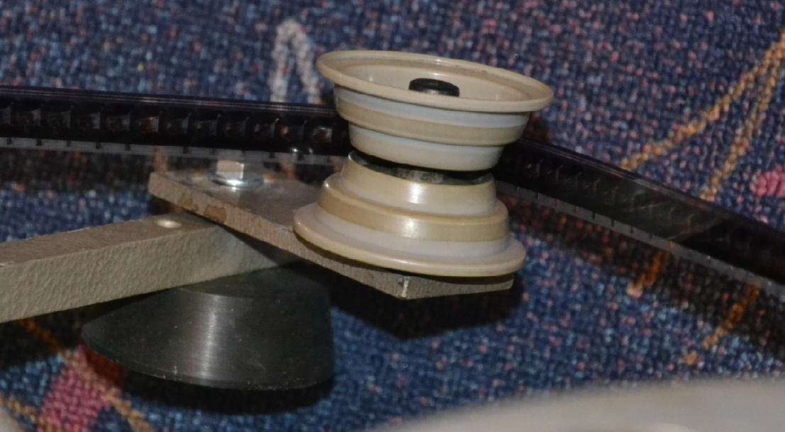 Vor dem ersten 16mm Einsatz habe ich mir für den Ausgleichsarm noch eine 35/16mm Umlenkrolle besorgt und montiert. So braucht hier kein Austausch vorgenommen zu werden. Von einem 35er-Profi habe ich erfahren, dass dieser Arm wohl auch schon zu manchem Unfall geführt haben soll. Wenn, aus was für einem Grund auch immer, die eigentlich frei laufende Spule blockieren sollte, würde der Film so schnell gespannt (und Polyester reißt noch nicht einmal), dass dies wie ein Abschuss auf den Arm wirkt. Da möchte e man nicht mit dem Kopf in der Nähe sein. Also habe ich mir dort noch eine Stahseilsicherung eingebaut.