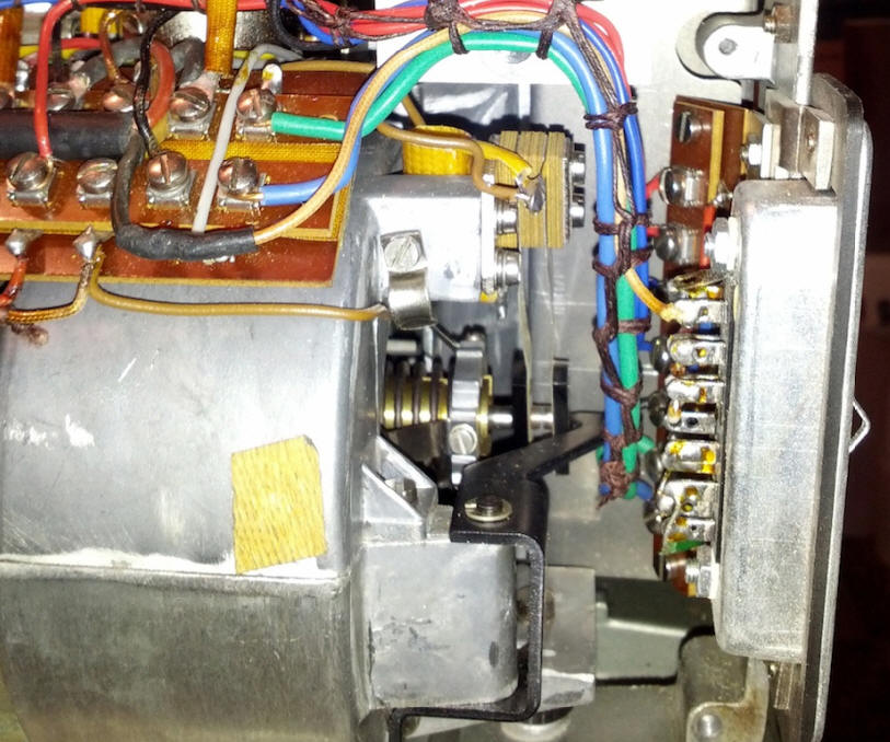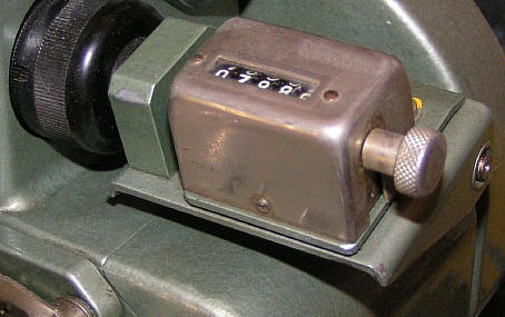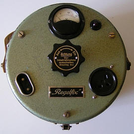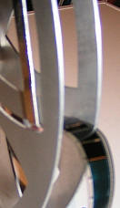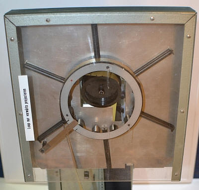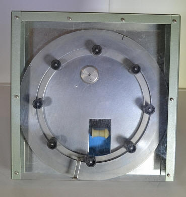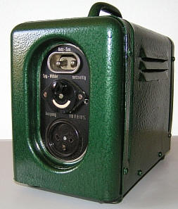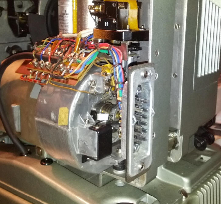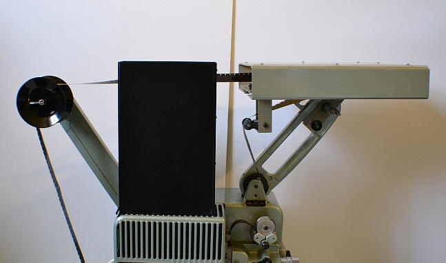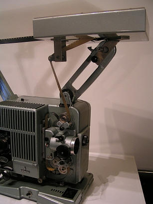 Hier ist ein Projektor mit aufgesetztem Loopadapter. Ein Film ( bis ca. 150m ) kann damit in einer Endlosschleife projeziert werden. Wurde zum Beispiel bei einer Messe für die Werbung genutzt. Der Film wird außen aufgewickelt und vom Kern wieder dem Projektor zugeführt. Die erforderliche Drehung wird nur über die Zugkraft des Films herbeigeführt. Mechanisch sehr pfiffig, wie ich finde !! Wie lange bei einem Nonstop-Lauf der Film durchhält - ?????? Der aufgesteckte Kamin ( über dem Vorwiderstand ) leitet den warmen Luftstrom am Film vorbei.