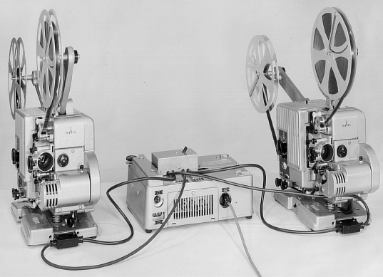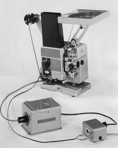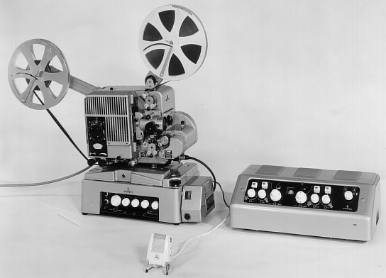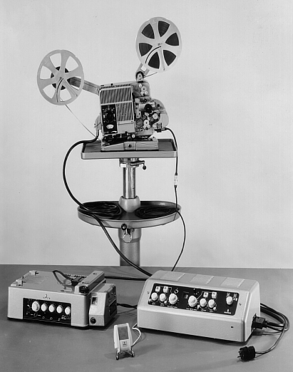 Dieses Werksfoto zeigt den Siemens Projektor 2000 mit aufgesetzter endloser Filmwicklung und angeschlossenen Filmrissschalter, der einen unbeobachteten Betrieb ermöglicht.
